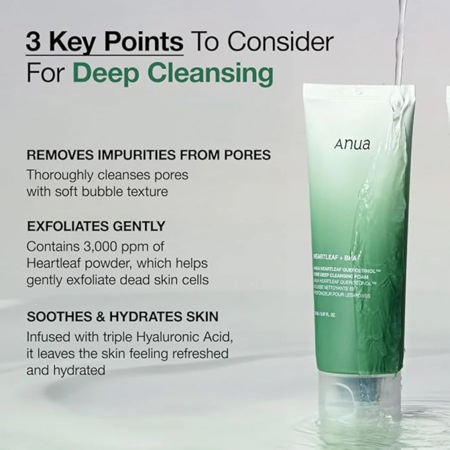 Achieve Clear & Healthy Skin with Gentle Deep Cleansing. Experience the transformative power of Anua’s Heartleaf Quercetinol Pore Deep Cleansing Foam. Formulated with 33.4% Houttuynia Cordata Extract and 10,000ppb Quercetin, this gentle cleansing foam effectively removes impurities and unclogs pores without stripping your skin’s natural moisture. Ideal for sensitive and acne-prone skin, it soothes irritation and promotes a clearer, healthier complexion. Discover the secret to radiant skin with Anua’s deep pore cleanser. Shop now for a gentle yet powerful cleansing experience.