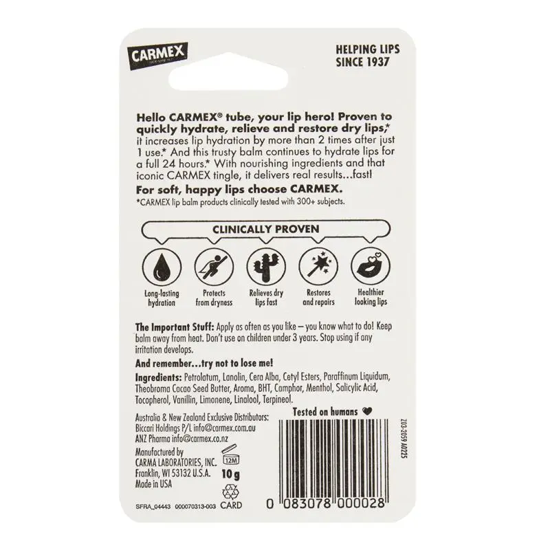 Carmex Classic Lip Balm Tube gives your lips the care they need by soothing dryness and restoring moisture instantly. Enriched with Menthol, Camphor, Beeswax, and Petrolatum, it cools, hydrates, and protects your lips effectively. It helps heal cracks, prevent further dryness, and maintain a protective barrier all day. Use daily for lips that feel soft, nourished, and refreshed.