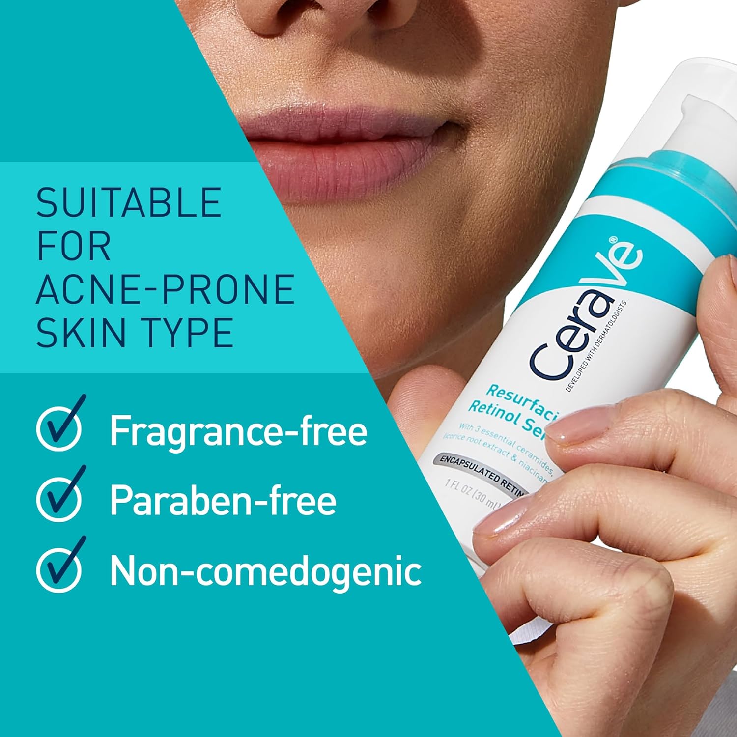 Achieve a more even, radiant complexion with CeraVe Resurfacing Retinol 30ml. Infused with ceramides, encapsulated retinol, niacinamide, licorice root extract, and cholesterol, it targets post-blemish dark spots and uneven skin texture while maintaining hydration. Perfect for sensitive and acne-prone skin, this serum supports long-term skin barrier health.