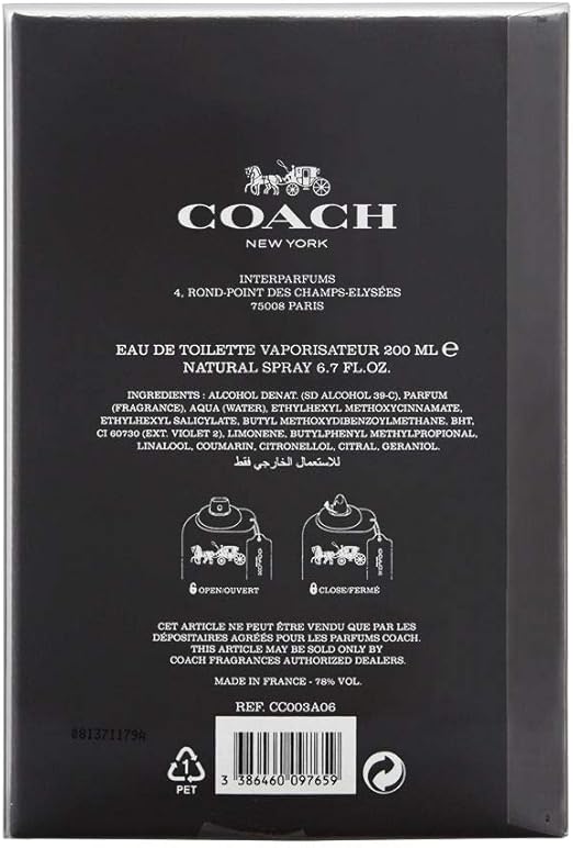Coach For Men Eau De Toilette by Coach is a refined Woody Aromatic fragrance for men, launched in 2017 and crafted by renowned perfumers Anne Flipo and Bruno Jovanovic. The fragrance opens with a fresh and invigorating burst of green nashi pear, bergamot, kumquat, lavender, and grapefruit, creating a lively and energizing introduction. Its heart blends cardamom, coriander, and geranium, adding a spicy-floral complexity that enhances sophistication and depth. The base notes of Haitian vetiver, suede, amberwood, and ambergris provide a warm, earthy, and masculine finish, leaving a long-lasting, confident trail.
