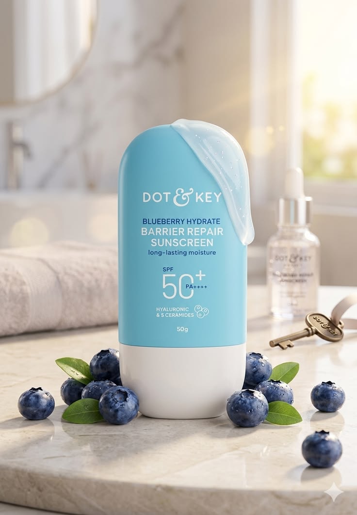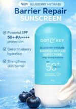 The Dot & Key Blueberry Hydrate Barrier Repair Sunscreen is a hydrating, high-protection sunscreen designed to nourish and protect the skin simultaneously. It is specifically formulated for those who suffer from dryness or a compromised skin barrier, offering a “water-light” feel with intense moisture.