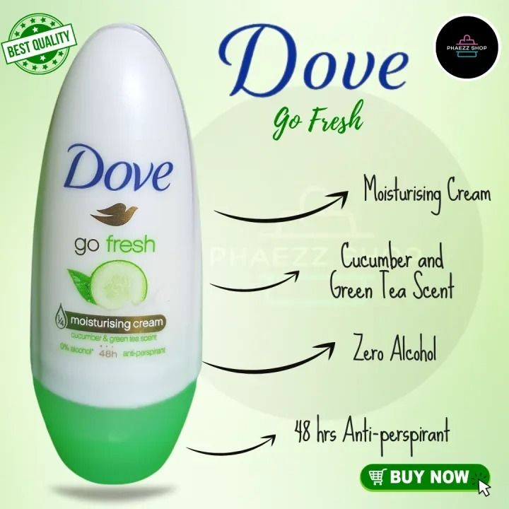 Stay fresh and confident all day long with Dove Go Fresh Cucumber & Green Tea Roll-On, a high-performance deodorant infused with natural cucumber and green tea extracts and enriched with ¼ moisturiser. The alcohol-free, gentle formula of the deodorant is specially designed for sensitive underarm skin, helping to nourish, soften, and smooth while providing long-lasting protection against sweat and odor for up to 48 hours.
