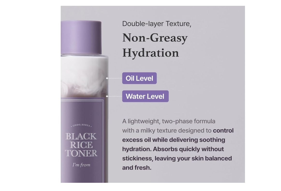 Meet the next-generation I’m From Black Rice Toner, specially designed for oily and acne-prone skin. This innovative toner harnesses the power of 100-day naturally fermented Jindo black rice, which is rich in anthocyanins to regulate sebum production, protect the skin from oxidative stress, and strengthen the skin barrier. Compared to regular black rice, Jindo black rice contains 2.4 times more anthocyanins, which further increase by 126% during fermentation, maximizing antioxidant and skin-protecting benefits.