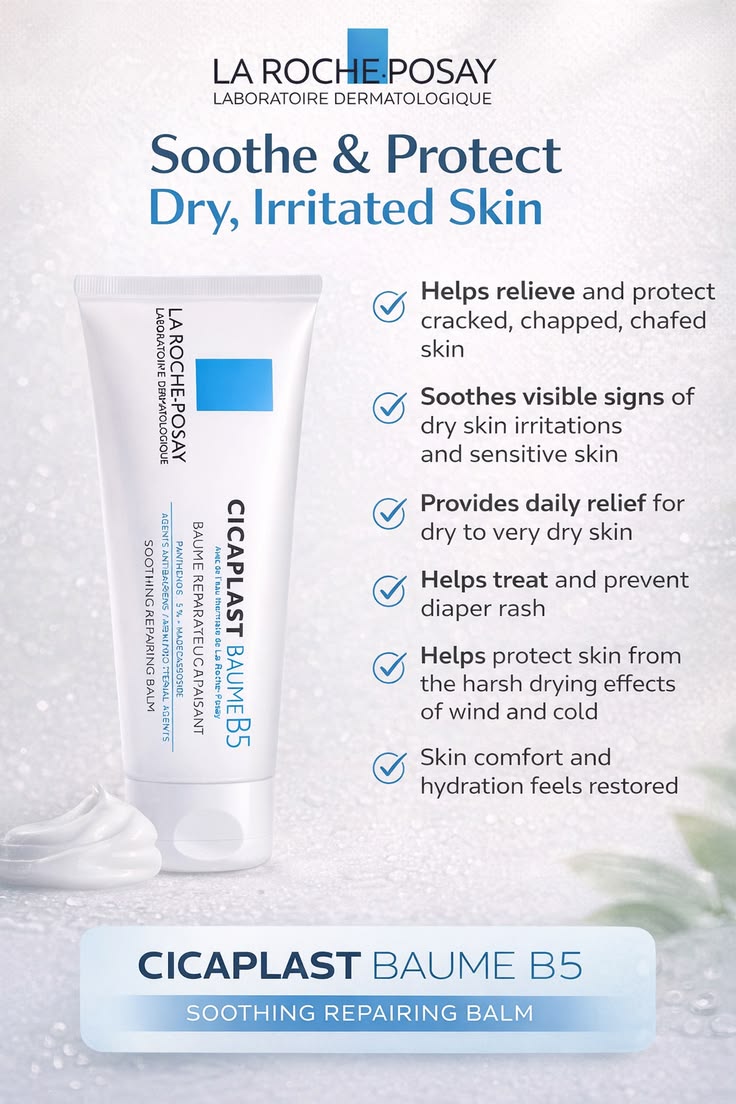 Your Go-To Solution for Soothing, Repairing, and Protecting Sensitive and Irritated Skin. Discover the power of La Roche-Posay Cicaplast Baume B5+, a dermatologist-recommended multi-repair balm designed to soothe and help protect sensitive skin. This comprehensive formula combines Panthenol (Vitamin B5) to soothe and promote skin recovery, Madecassoside to aid in skin renewal, and Tribioma, a unique prebiotic complex to help rebalance the skin microbiome. Enriched with La Roche-Posay Thermal Spring Water, known for its soothing and antioxidant properties, this balm provides immediate relief and helps to accelerate the natural skin repair process. Its rich, nourishing texture creates a protective barrier on the skin, making it ideal for a variety of skin concerns, including dryness, redness, minor cuts, scrapes, and post-procedure skin. Keep Cicaplast Baume B5+ on hand for the whole family to soothe, repair, and restore comfort to sensitive and irritated skin. Shop now for gentle and effective skin recovery.