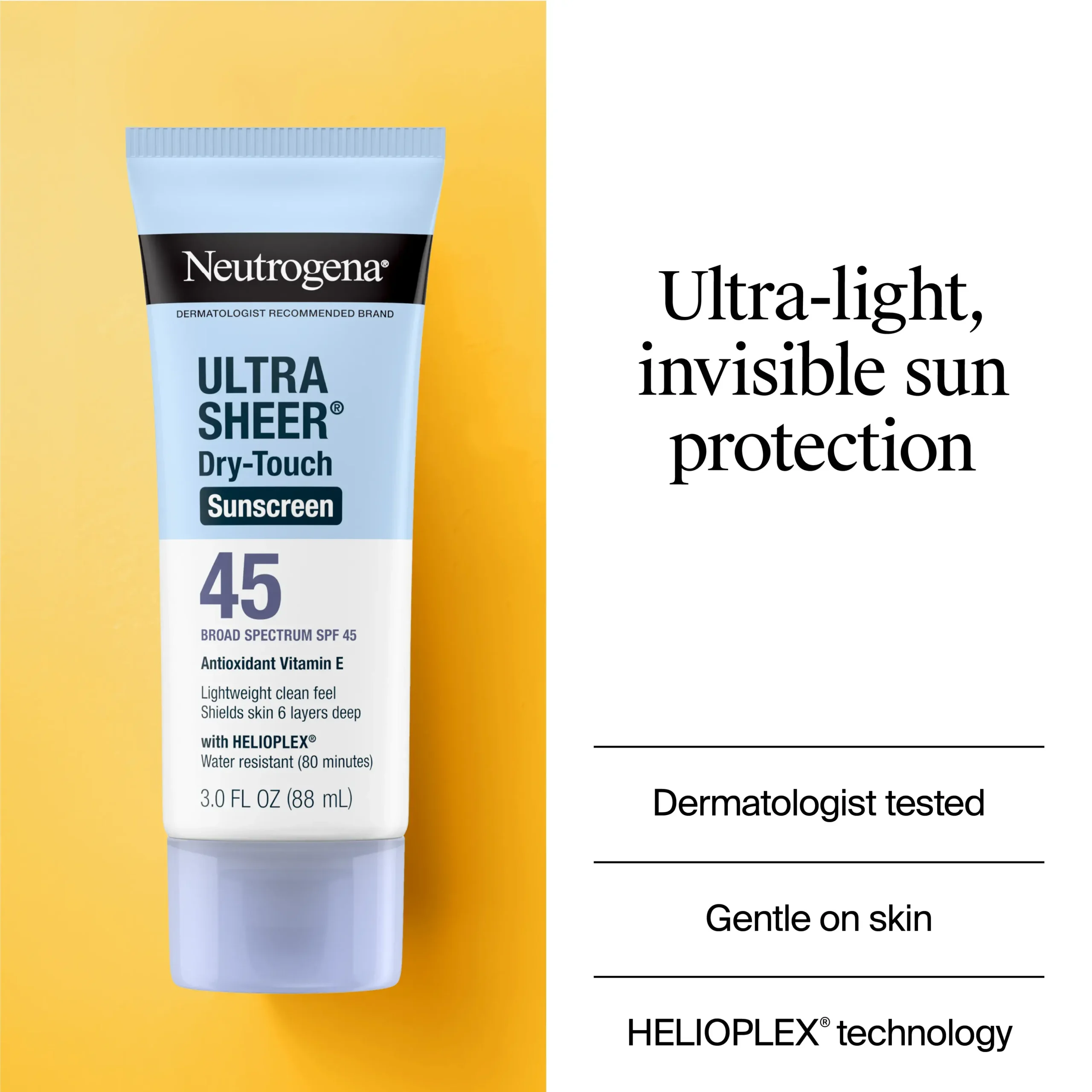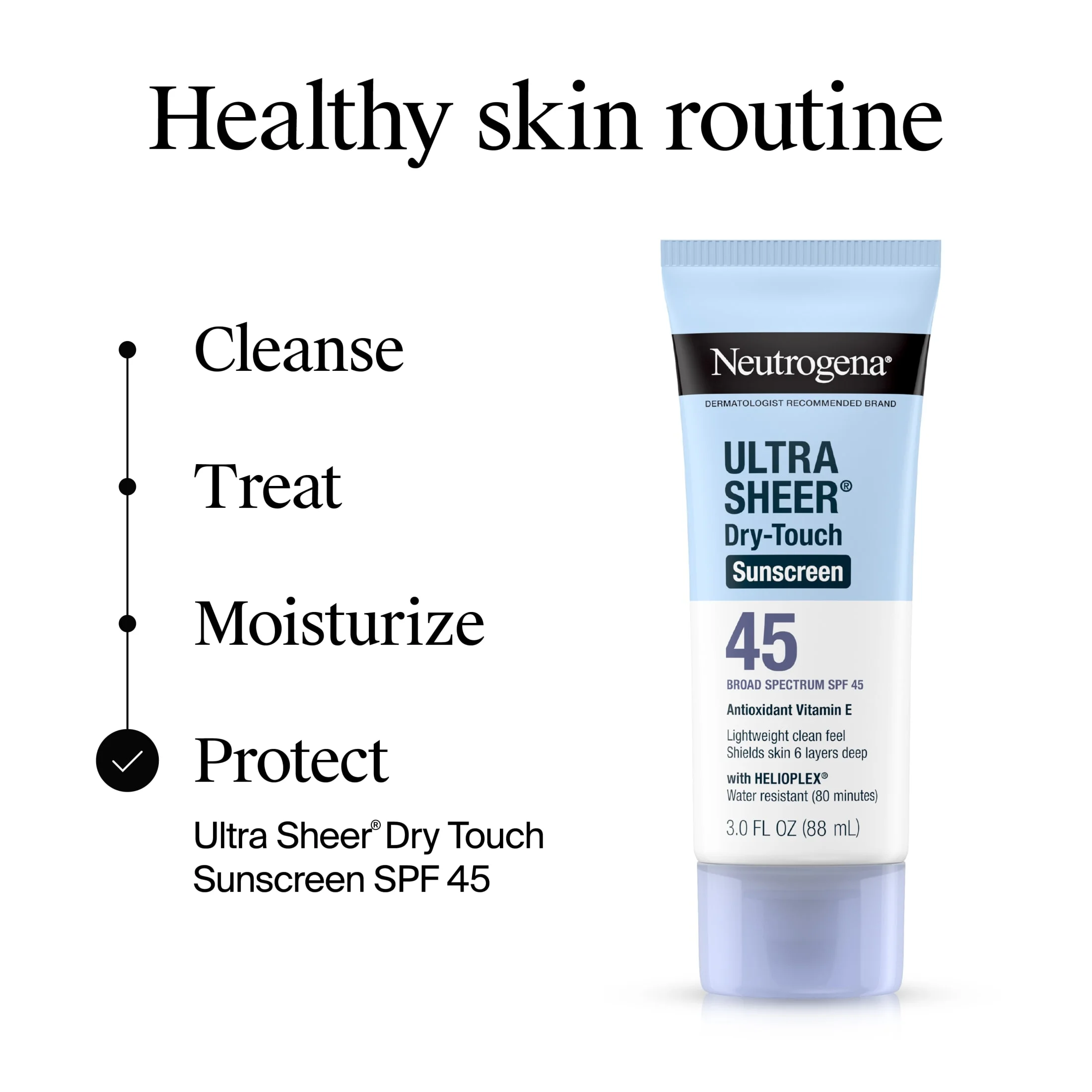 Protect your skin every day with Neutrogena Ultra Sheer Dry-Touch Sunscreen SPF 45, a lightweight, fast-absorbing sunscreen designed for all skin types, including oily and sensitive skin. This dermatologist-recommended formula uses Helioplex® technology to provide broad-spectrum protection against both UVA rays (which cause aging) and UVB rays (which cause sunburn).