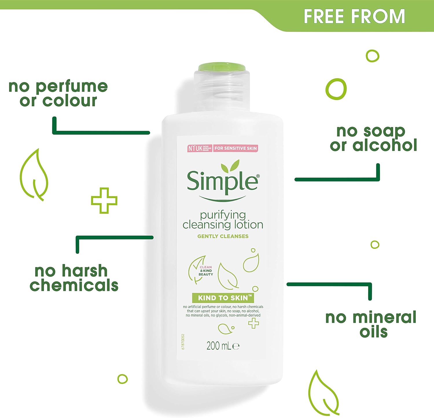Simple Purifying Cleansing Lotion 200ml is specially formulated for sensitive skin, providing a gentle yet effective cleanse. Enriched with multi-vitamins and skin-loving ingredients, it nourishes, hydrates, and soothes the skin while removing dirt, oil, and light makeup. Free from harsh chemicals, artificial colors, and perfumes, this vegan-friendly lotion purifies without irritation, leaving your skin feeling fresh, soft, and balanced. Its lightweight formula helps maintain the skin’s natural moisture barrier while promoting a healthy, radiant complexion. Ideal for daily use, it ensures a soothing and gentle cleanse suitable for all skin types, especially sensitive skin.
