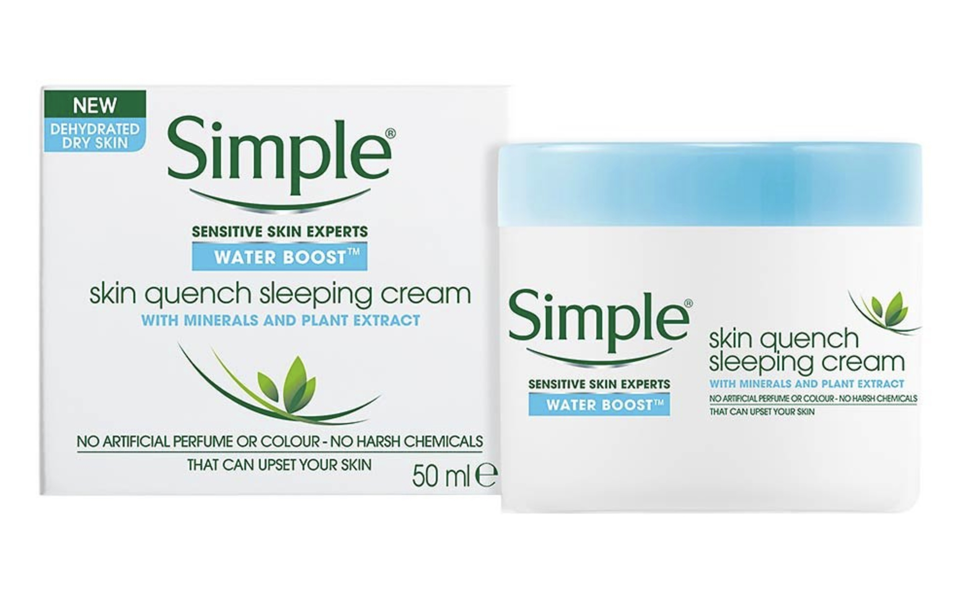 Gently massage Simple Water Boost Skin Quench Sleeping Cream onto your face and neck using upward, outward motions.